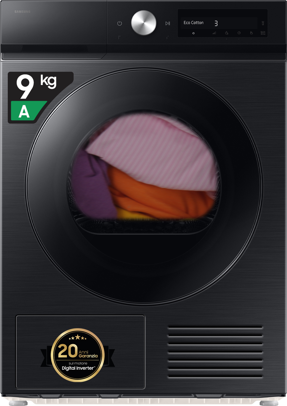 Met de Samsung DV90DB7845GBU3 droog je een lading van 9 kilogram wasgoed op een energiezuinigere manier dan met een klassieke condensdroger, dankzij de warmtepomptechnologie. Die recycleert warme lucht en verbruikt hierdoor minder energie per droogbeurt. De invertormotor zorgt voor een stille werking, zodat de droogkast rustig op de achtergrond draait. Via de SmartThings-app bedien je het toestel op afstand en ontvang je programmavoorstellen en onderhoudstips op basis van je gebruiksgewoontes. Heb je ook een Samsung wasmachine, dan kiest de Auto Cycle Link-functie na het wassen automatisch een geschikt droogprogramma. De trommelverlichting helpt je om kledingstukken makkelijker terug te vinden na het drogen. Het condenswater wordt via een afvoerkit direct afgevoerd, zodat je het opvangbak niet handmatig hoeft leeg te maken. De deur is omkeerbaar, zodat je de droogkast links of rechts kunt inpassen in je opstelling.