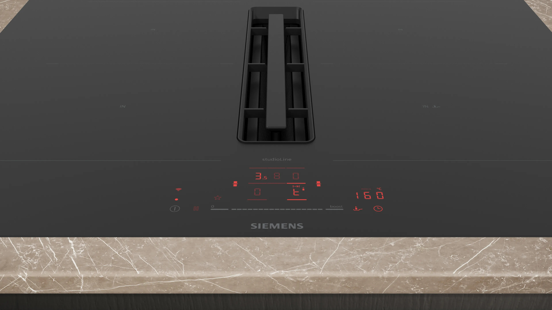 Kookplaat IQ500 Inductie-geïntegreerde ventilatie 70 cm, combiInduction, 4 zones, 2 combiZones, touchSlider met 17 vermogensstanden, fryingSensor Pro, powerBoost alle zones, 2 timers (alternative), Home Connect - cookConnect, iQdrive, 9 standen + 2 intensief, 500 / 622 m3/h, 69 dB, vlak integreren, 7.400 W, klasse B Facet design black B
