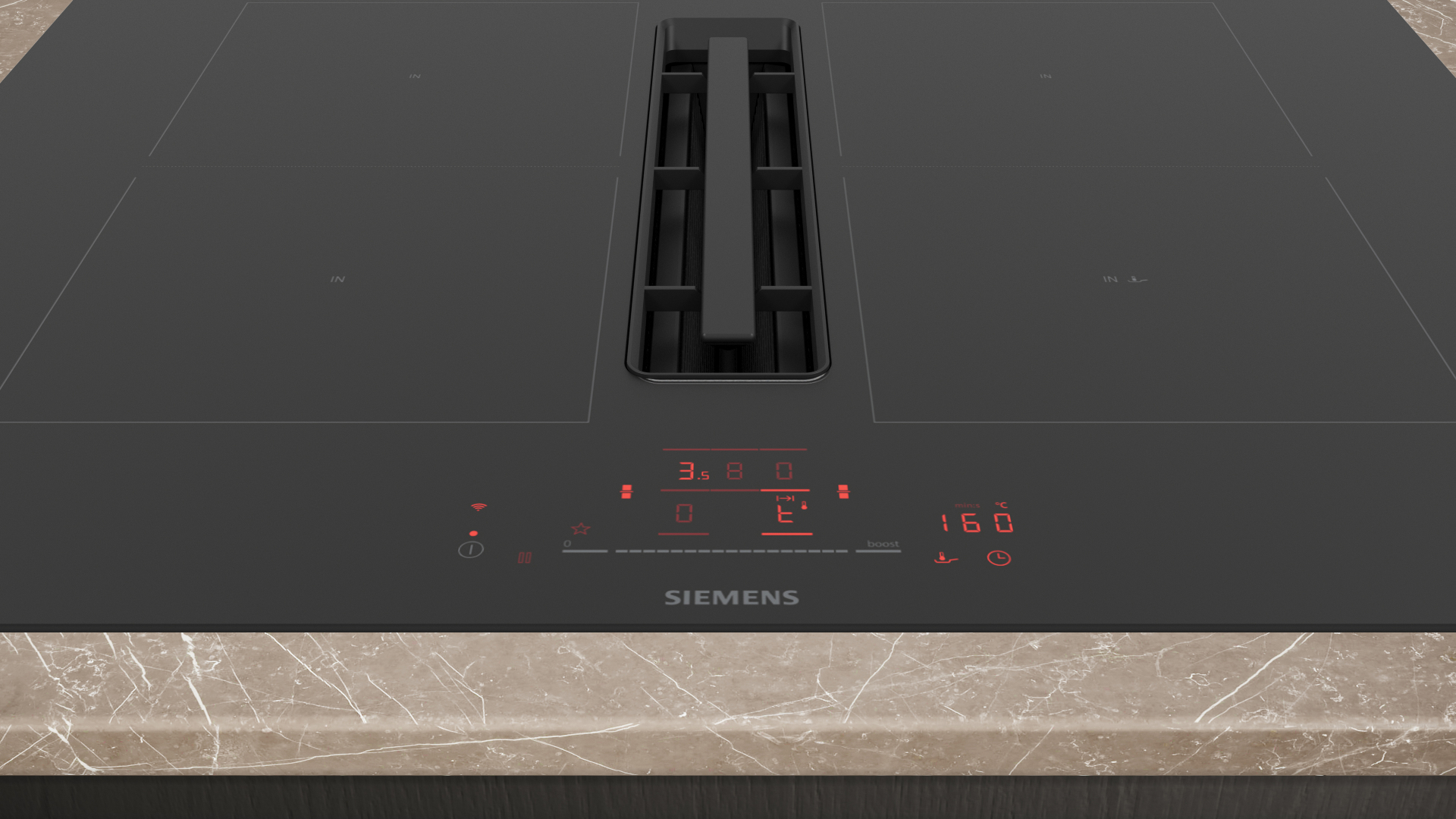 Kookplaat IQ500 Inductie-geïntegreerde ventilatie 70 cm, combiInduction, 4 zones, 2 combiZones, touchSlider met 17 vermogensstanden, fryingSensor Pro, powerBoost alle zones, 2 timers (alternative), Home Connect - cookConnect, iQdrive, 9 standen + 2 intensief, 500 / 622 m3/h, 69 dB, randloos, 7.400 W, klasse B Zonder kader B