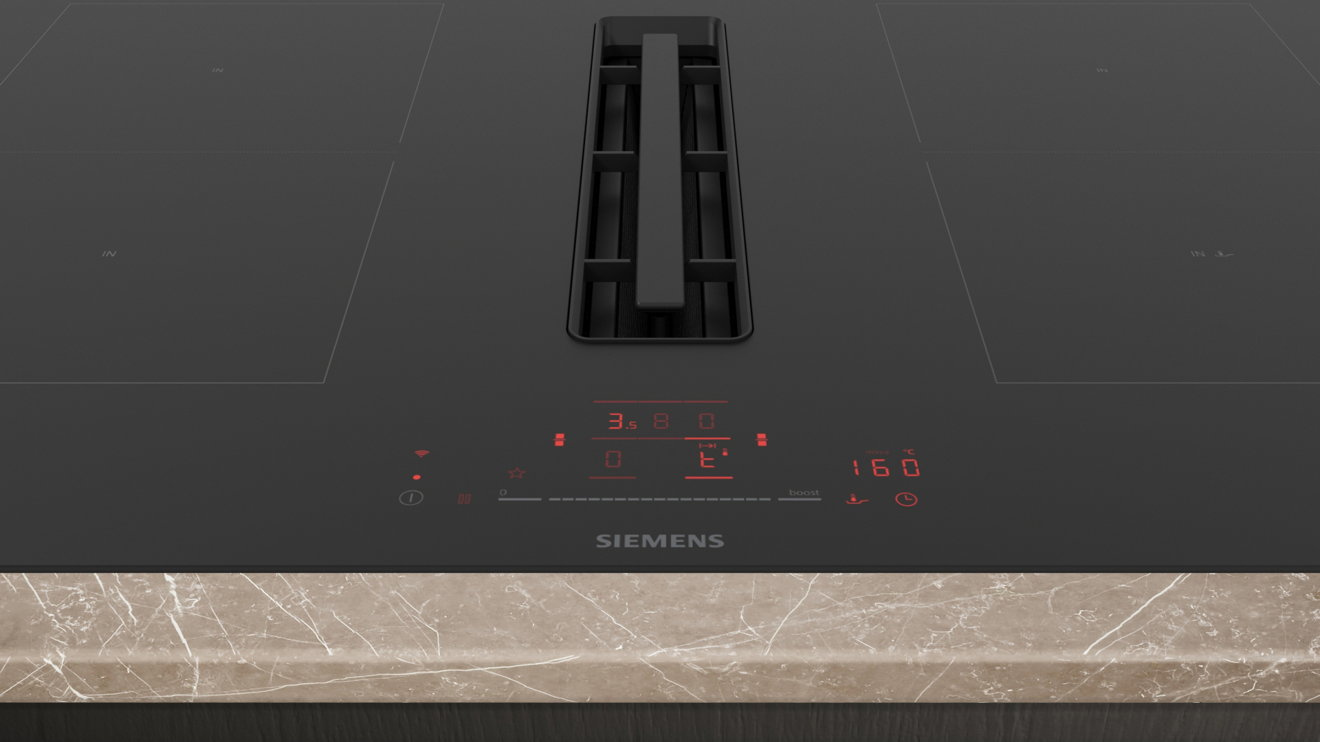 Kookplaat IQ500 Inductie-geïntegreerde ventilatie 80 cm, combiInduction, 4 zones, 2 combiZones, touchSlider met 17 vermogensstanden, fryingSensor Pro, powerBoost alle zones, 2 timers (alternative), Home Connect - cookConnect, iQdrive, 9 standen + 2 intensief, 500 / 622 m3/h, 69 dB, randloos, 7.400 W, klasse B Zonder kader B