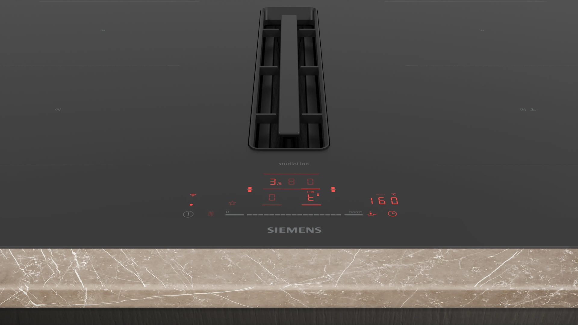 Kookplaat IQ500 Inductie-geïntegreerde ventilatie 80 cm, combiInduction, 4 zones, 2 combiZones, touchSlider met 17 vermogensstanden, fryingSensor Pro, powerBoost alle zones, 2 timers (alternative), Home Connect - cookConnect, iQdrive, 9 standen + 2 intensief, 500 / 622 m3/h, 69 dB, comfort profiel blackSteel, 7.400 W, klasse B Facet design black B