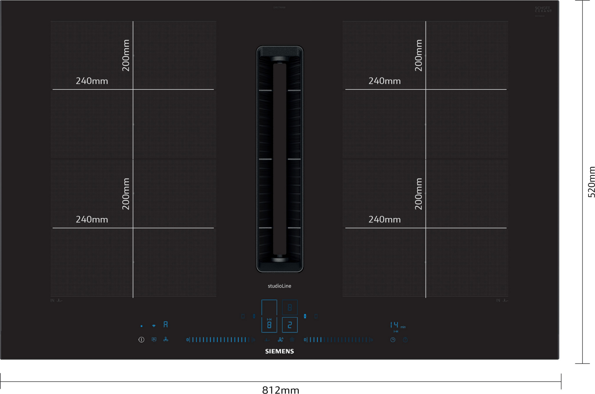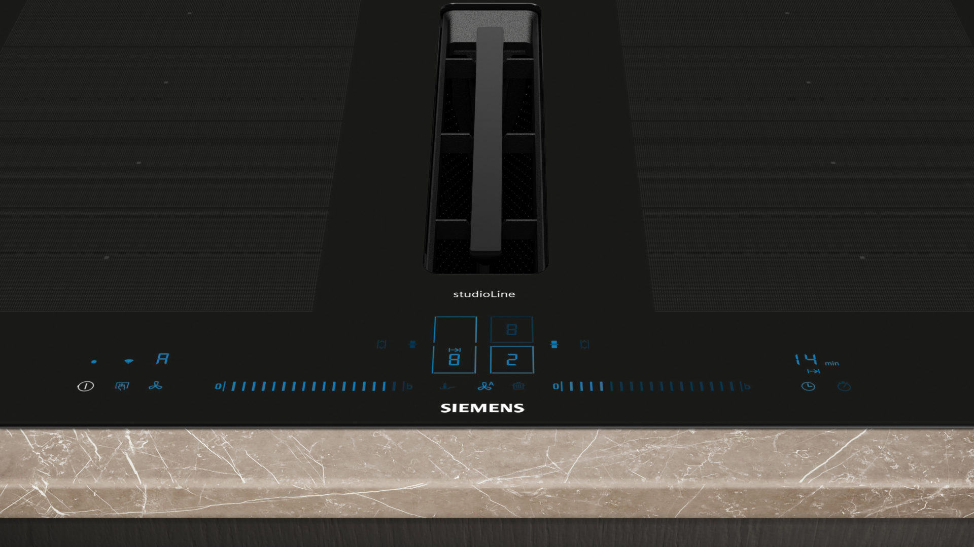 Kookplaat IQ700 Inductie-geïntegreerde ventilatie 80 cm, flexInduction, 4 zones, 2 flexZones, Blauwe dual lightSlider met 17 vermogensstanden, intelligent flexZones, powerMove Plus, fryingSensor Plus, cookingSensor Plus ready, powerBoost alle zones, 3 timers, Home Connect - cookConnect, iQdrive, 17 standen + 2 intensief, 500 / 622 m3/h, 69 dB, climateControl sensor, comfort profiel blackSteel, 7.400 W, klasse B Facet design black B