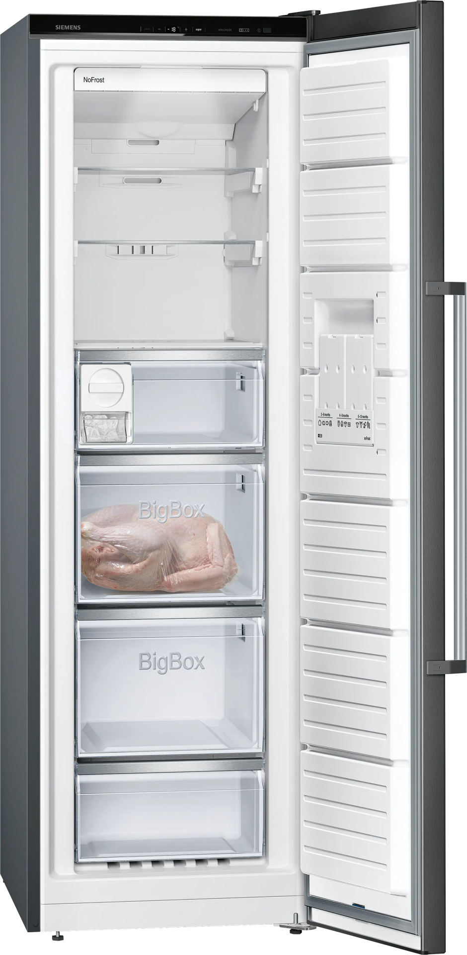 Diepvriezer - vrijstaand - Kastmodel noFrost - IQ500 - noFrost, Klasse E, 39 dB, Freezer Light, 242 l, zwart geborsteld staal AntiFingerprint deuren, externe handgreep, Twist Ice Box removable, hoogte 186,00 cm