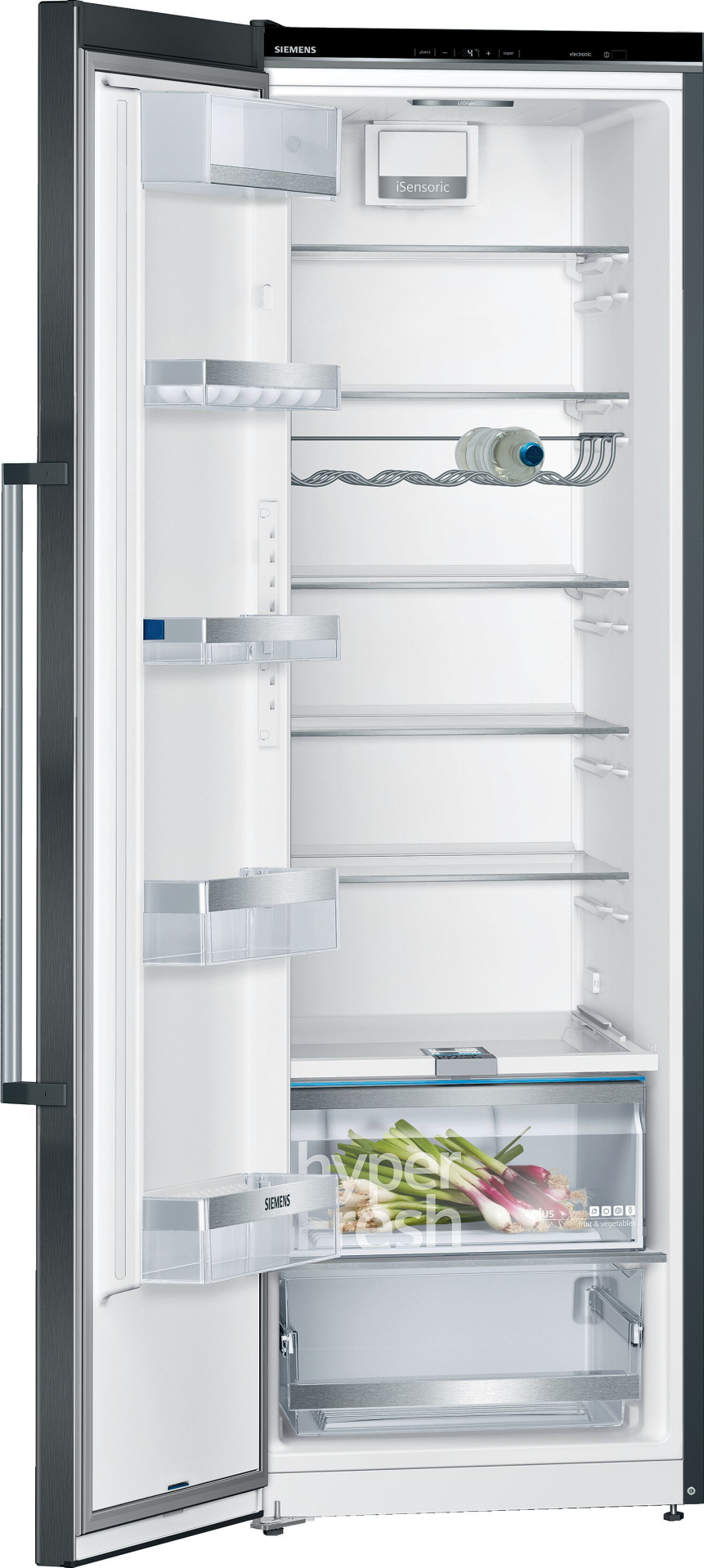 Koelkast - vrijstaand - Eéndeurskoelkast - IQ500 - Klasse E, 39 dB, hyperFresh plus, LED verlichting, verchroomd flessenrek, 346 l, zwart geborsteld staal AntiFingerprint deuren, externe handgreep, hoogte 186,00 cm