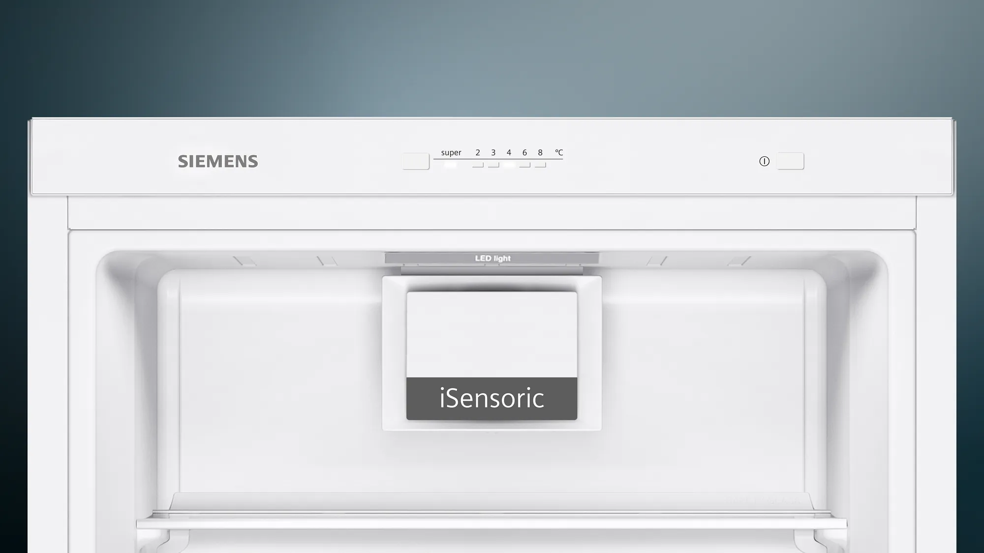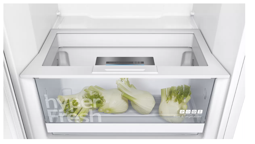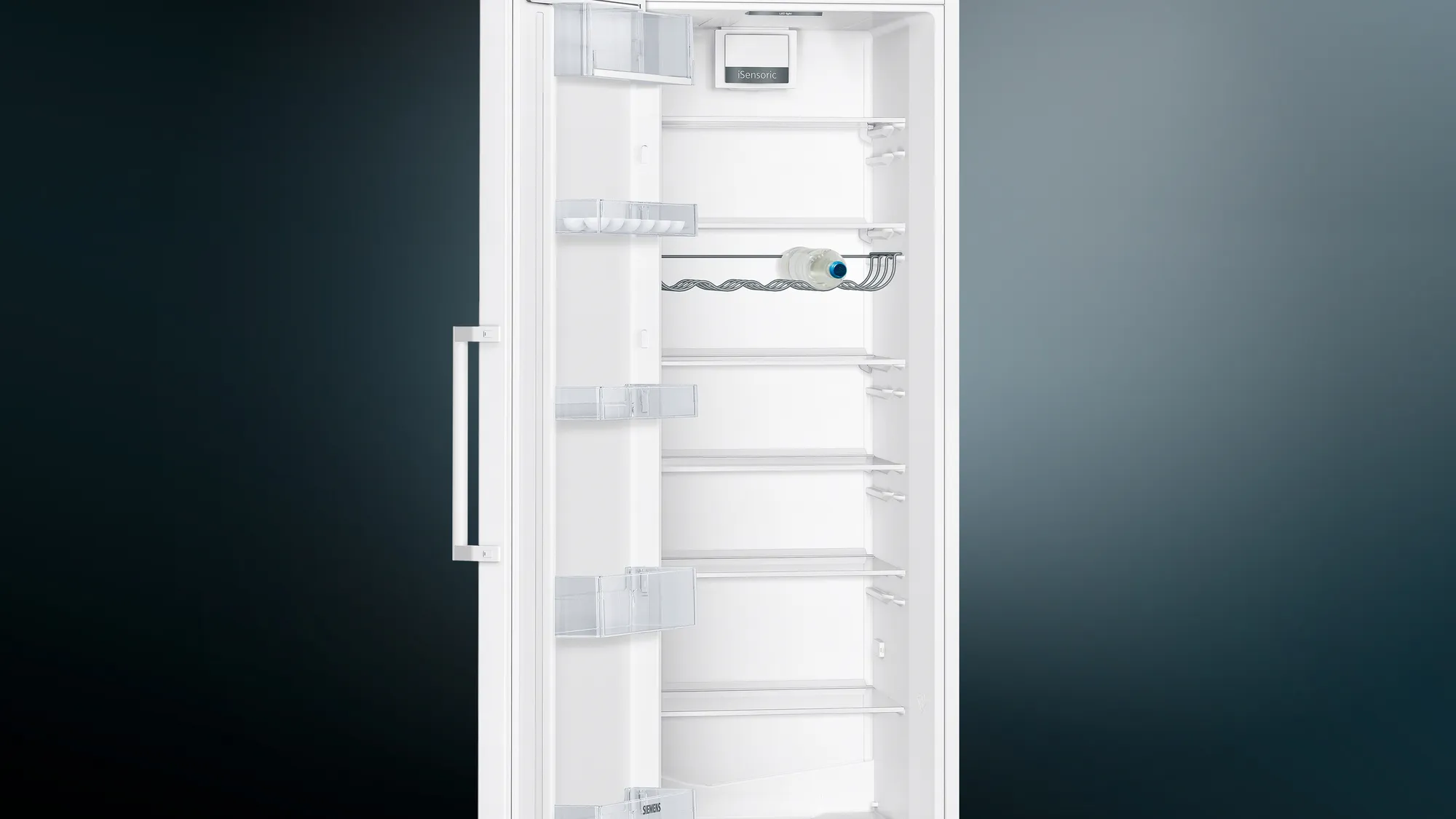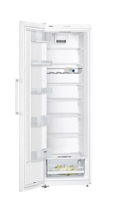 Koelkast - vrijstaand IQ300 Eéndeurskoelkast Klasse D, 39 dB, hyperFresh, LED verlichting, verchroomd flessenrek, 346 l, wit, externe handgreep, hoogte 186,00 cm Wit D