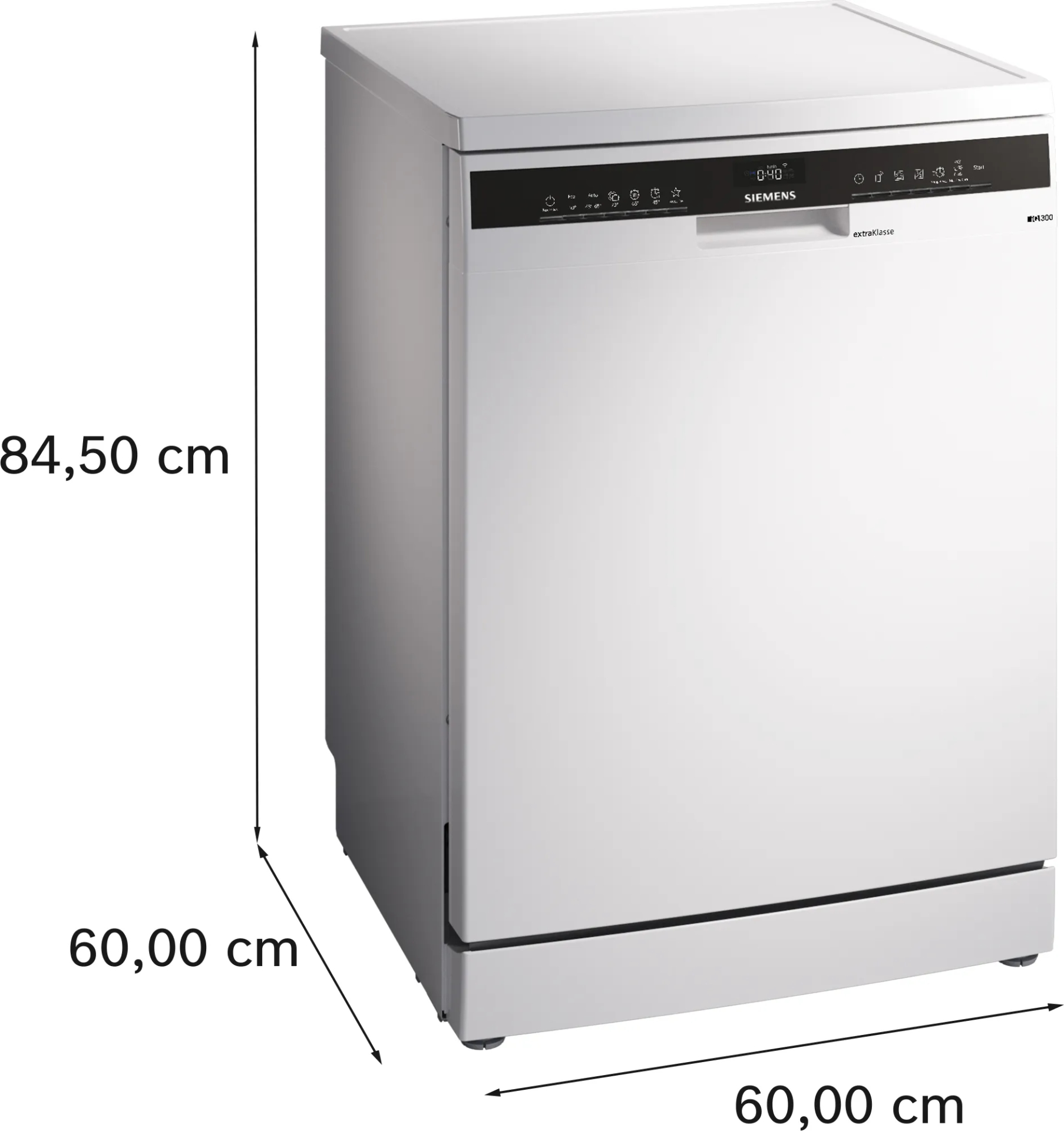 Vaatwasser IQ300 Vrijstaand Klasse B, Home Connect, 6 progr, 5 functies, wit, warmtewisselaar / drying assist, kuip inox, 9,0 l, 42 dB, Retrofit, Vario Flex korven, Rackmatic 3, 7 segments display direct select Wit B