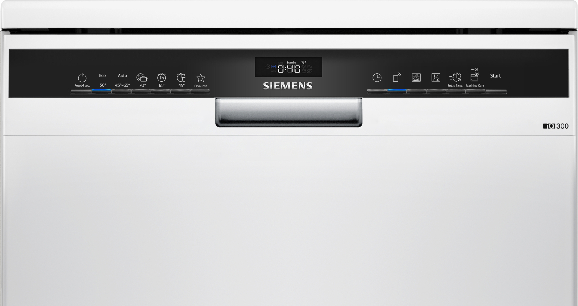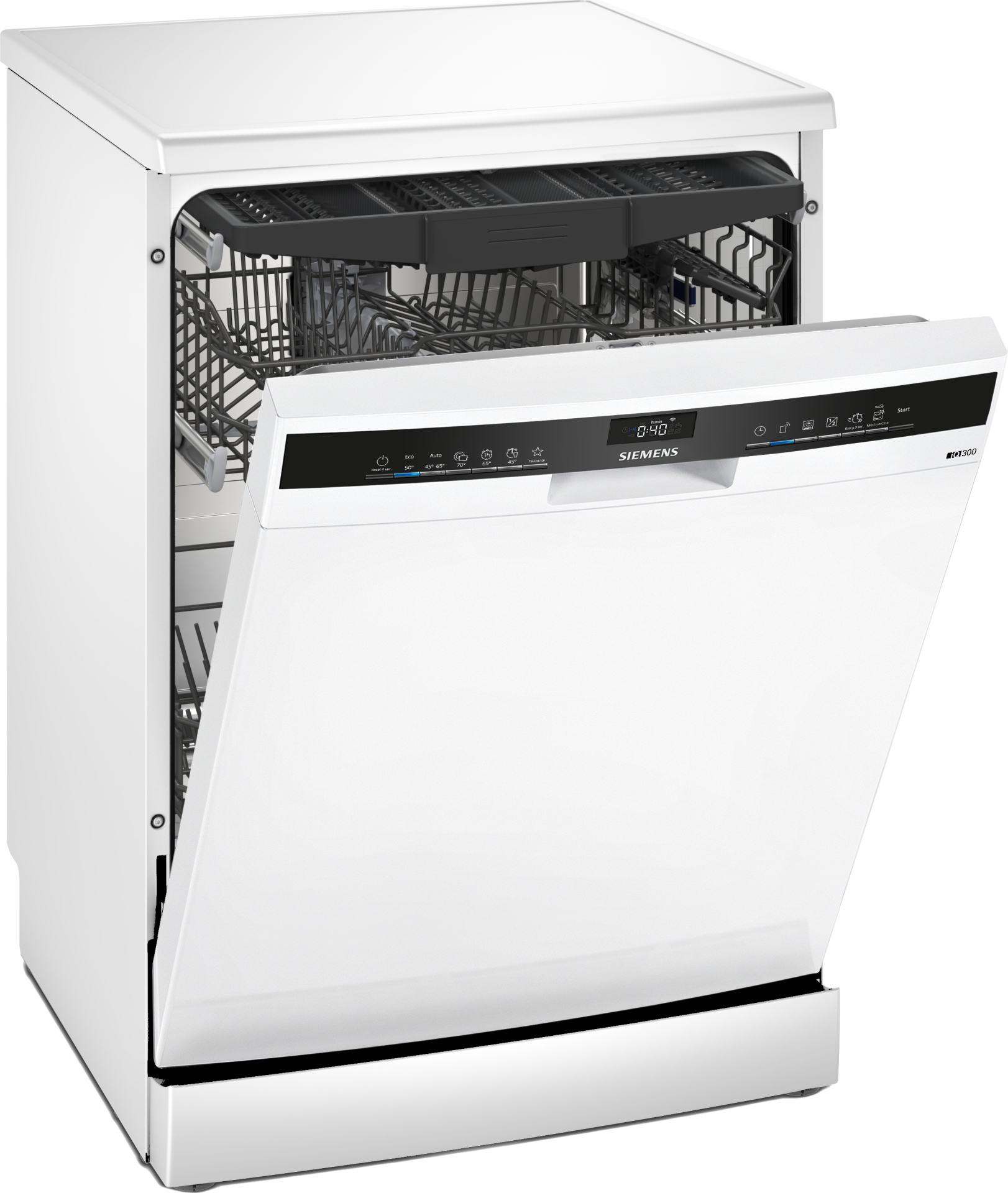 Vaatwasser IQ300 Vrijstaand Klasse D, Home Connect, 6 progr, 5 functies, wit, warmtewisselaar, kuip inox, 9,0 l, 42 dB, besteklade, Vario Flex korven, Rackmatic 3, 7 segments display direct select Wit D